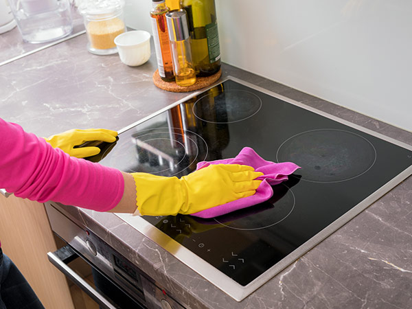 - Greasy kitchen? Stove tops can become caked with grease and stuck food residue from all those nights of family dinners. Before the holiday cooking begins and guests arrive, mix warm water, vinegar, and dish soap. Let this mixture sit for a few minutes and wipe down. This works for almost all types of stove tops. If you need some scrubbing, abrasive action, baking soda can help to scrub away stubborn grease. When was the last time you pulled out your stove and cleaned the sides and behind it? All the buildup can cause a stinky smell. Now is the time to clean with an all-purpose cleaner or the vinegar, water, and soap mixture.