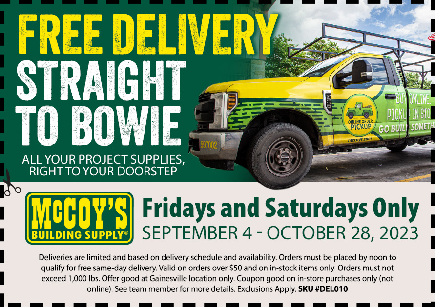 Busy with a project and can’t get away? Let us deliver those materials for whatever you’re working on in Bowie on one of our green-and-yellow pickups. Every Friday and Saturday starting September 4 through October 28, 2023, get free delivery directly from us right when you need it most.