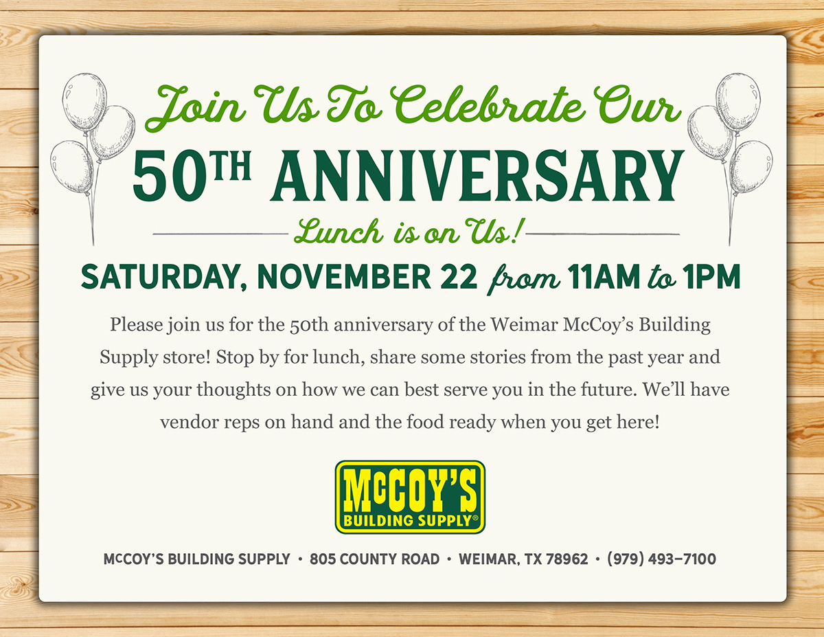 Thank you for choosing McCoy’s Building Supply! We value each and every customer! We have proudly served Weimar and the surrounding communities since 1975.